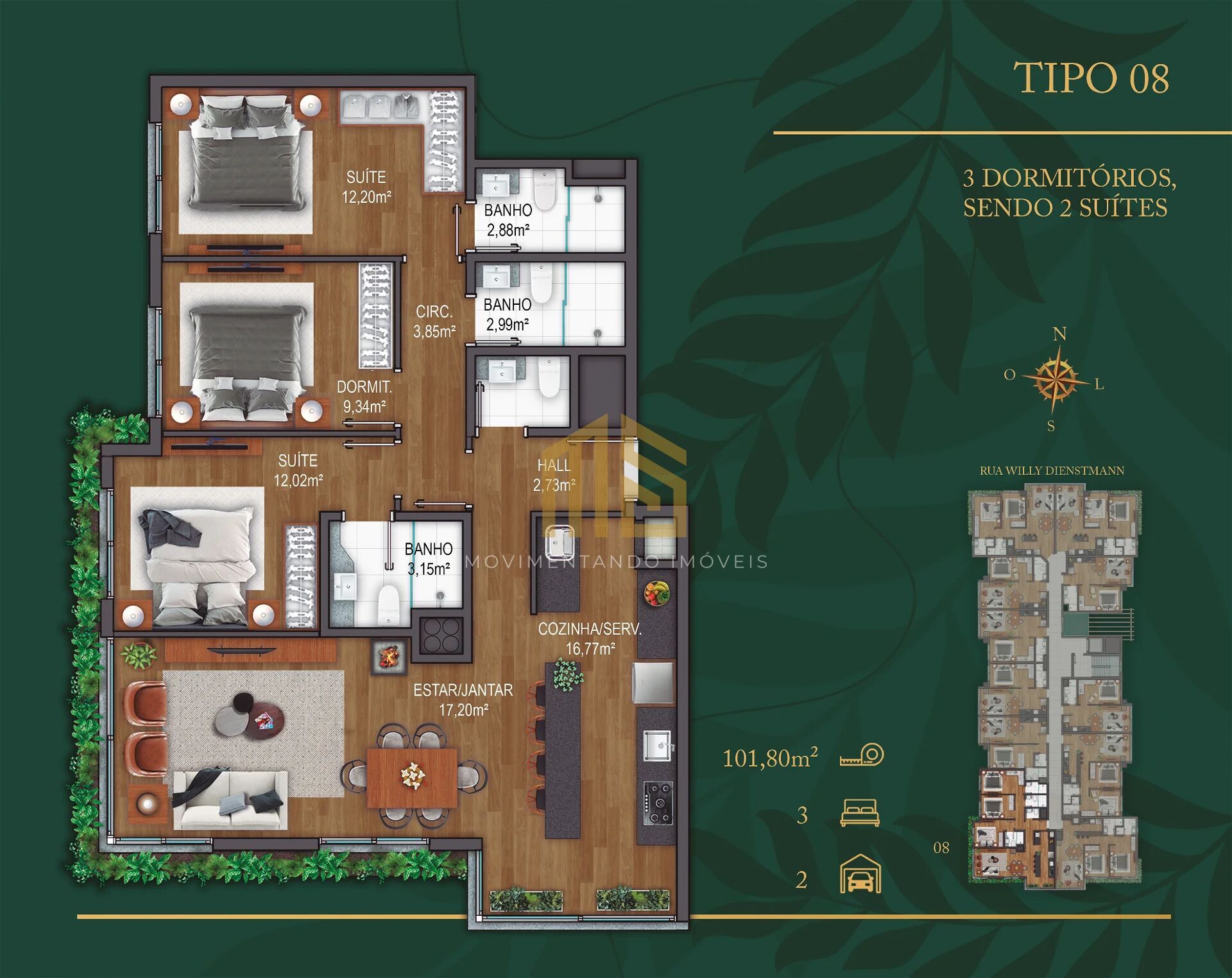 3 Dormitórios, sendo 2 suítesGaragens