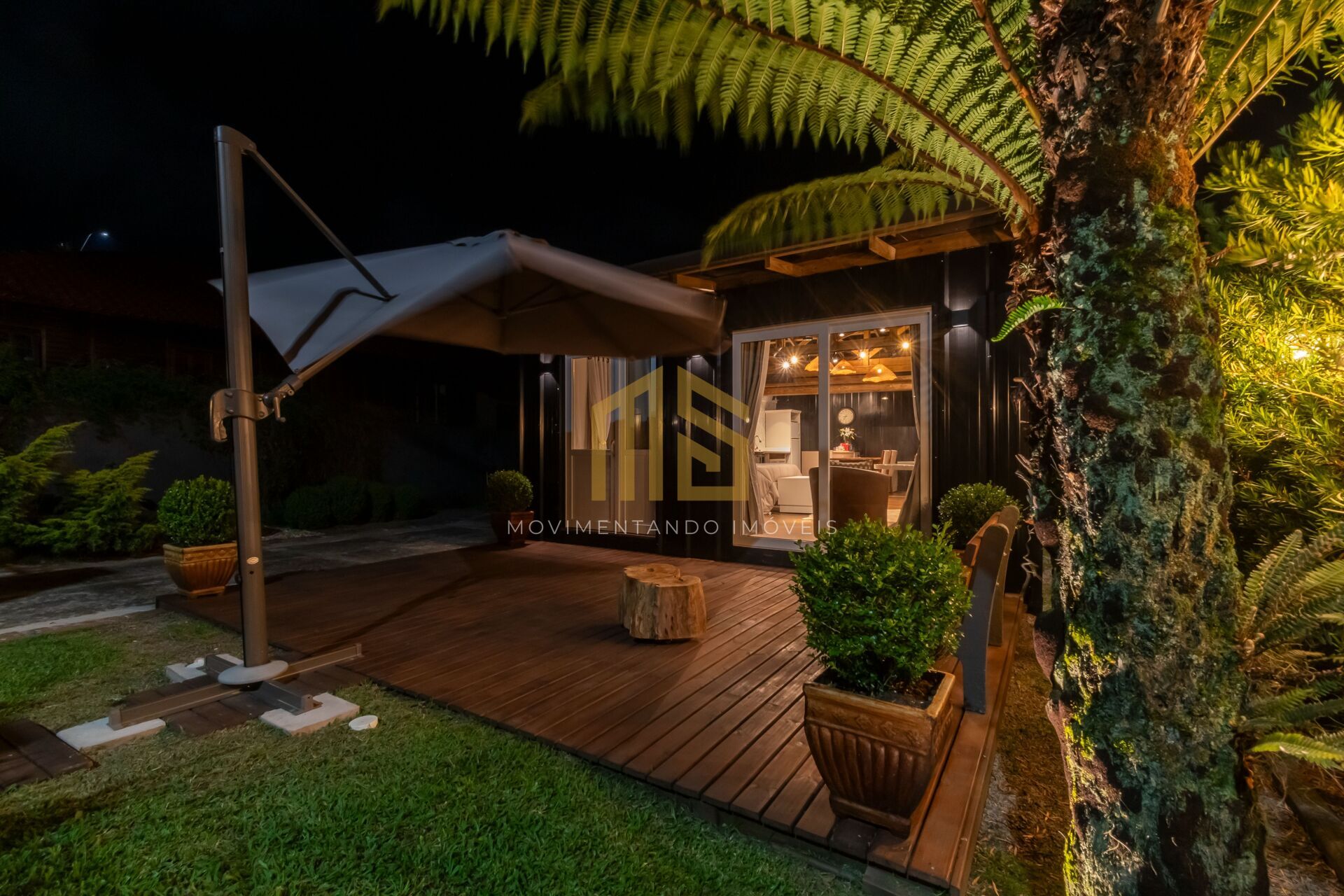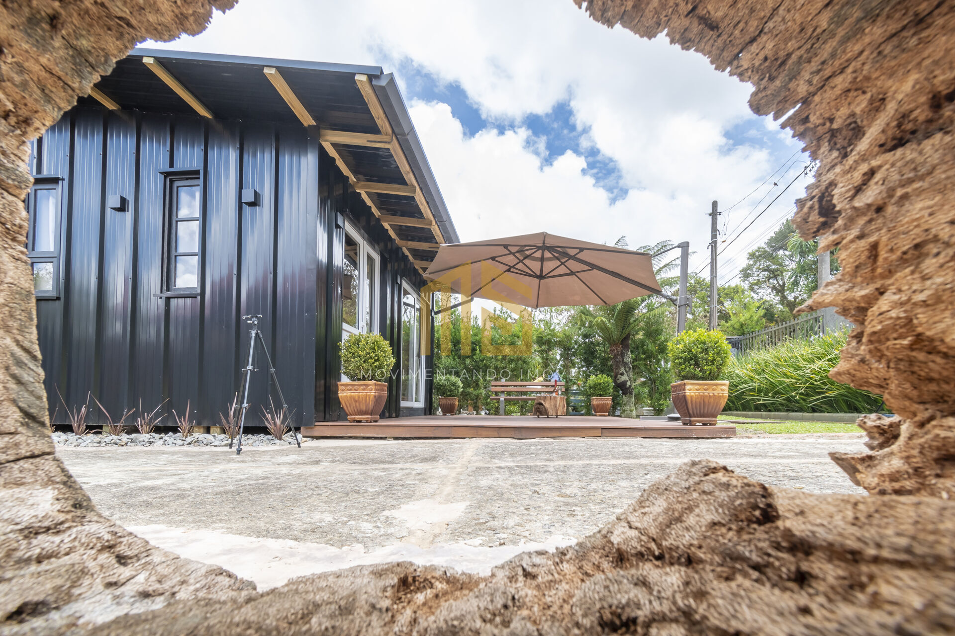 - Espaço conta com com um deck na parte frontal, com um banco e um ombrelone.