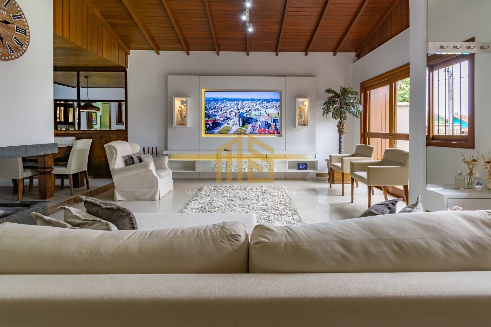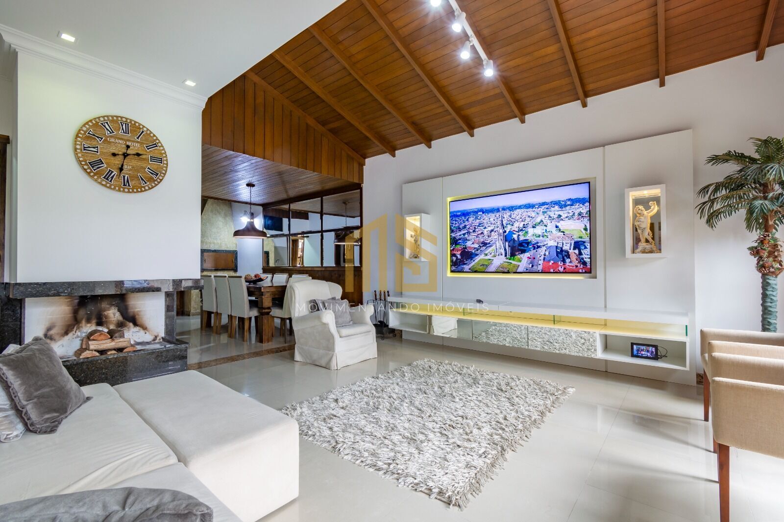 Casa construída em alvenaria, com aberturas em madeira nobre (grápia), excelente acabamento interno, massa corrida e texturas nas paredes, porcelanato no térreo e piso laminado no pavimento superior, teto rebaixado em gesso, rodapés em mármore, lareira para os dias frios, pé direito alto, ampla sala de estar e sala de jantar, 2 cozinhas sendo uma americana, churrasqueira com pia na lateral, 2 banheiros sociais, 4 dormitórios com iluminação em LED, sendo um deles suíte com closet e sacada e outro quarto de casal com porta veneziana, deck e pergolado.