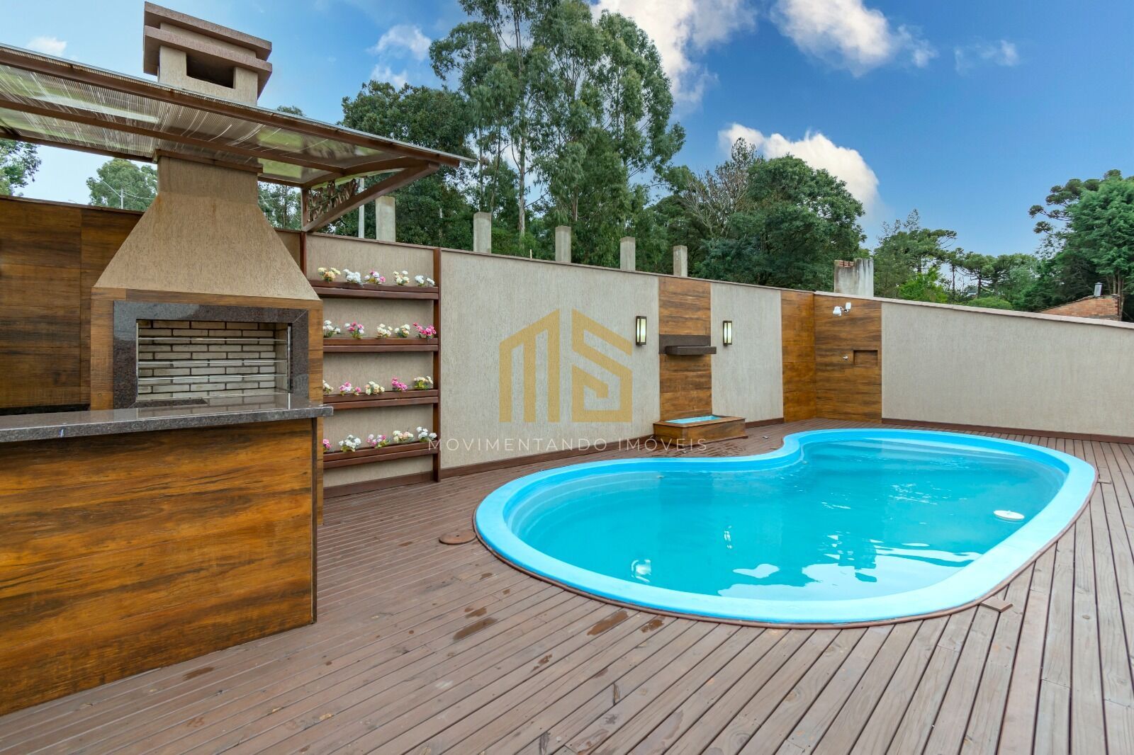 Além de tudo isso a área social do imóvel possuí uma piscina aquecida com fonte e iluminação interna, deck em madeira nobre, casa de máquinas protegida, quiosque com churrasqueira, pia, fogão, bancada de mármore e um chuveiro externo.