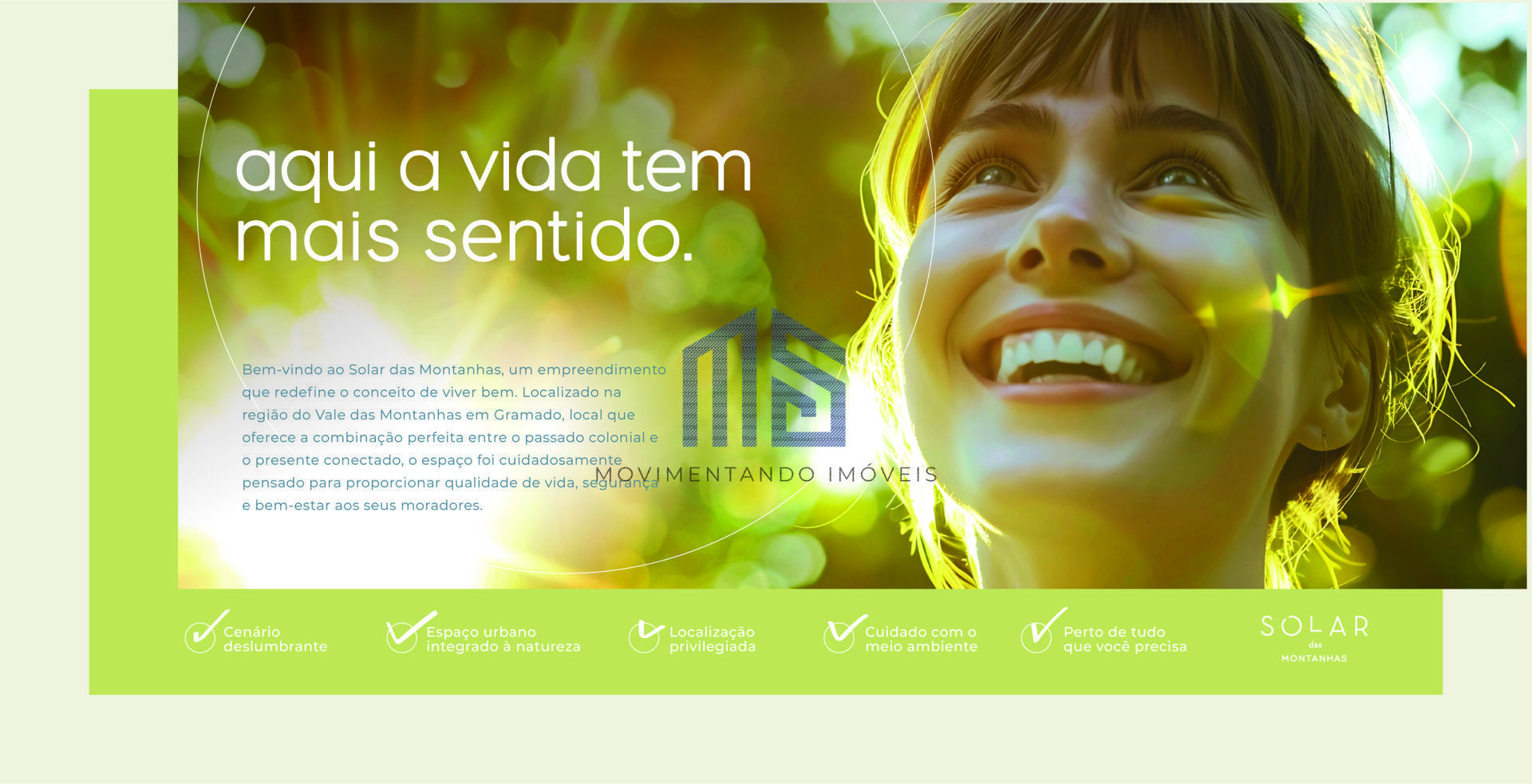 Empreendimento com ótima localização, em área plana, com uma vista deslumbrante do Vale das Montanhas. Constituído por 82 lotes, com um desenho urbano confortável e espaços coletivos que proporcionam vivências de qualidade.